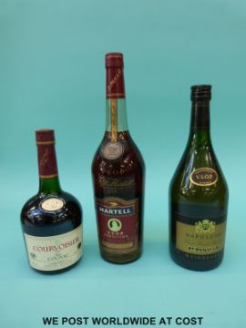 Courvoisier Cognac boxed, Martell VSOP Medaillon old fine cognac and a bottle of Napoleon brandy, 70cl, 40% vol