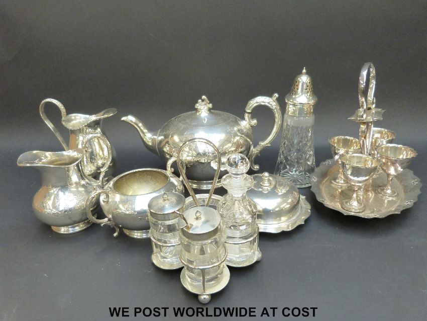 A variety of silver plate including a tea service, cruet, egg set etc
