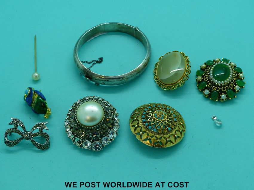 A collection of costume brooches to include an enamel owl and a hallmarked silver bangle