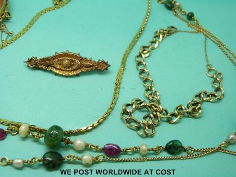 A 9ct gold necklace set with pearls, rubies and emeralds, yellow metal bracelet marked 9ct gold, Victorian yellow metal brooch and a 9ct gold cameo brooch etc