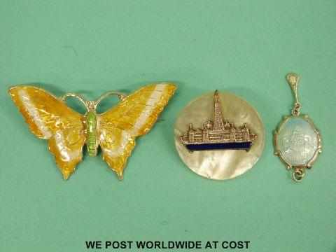 A silver butterfly brooch set with enamel, brooch and an enamel pendant