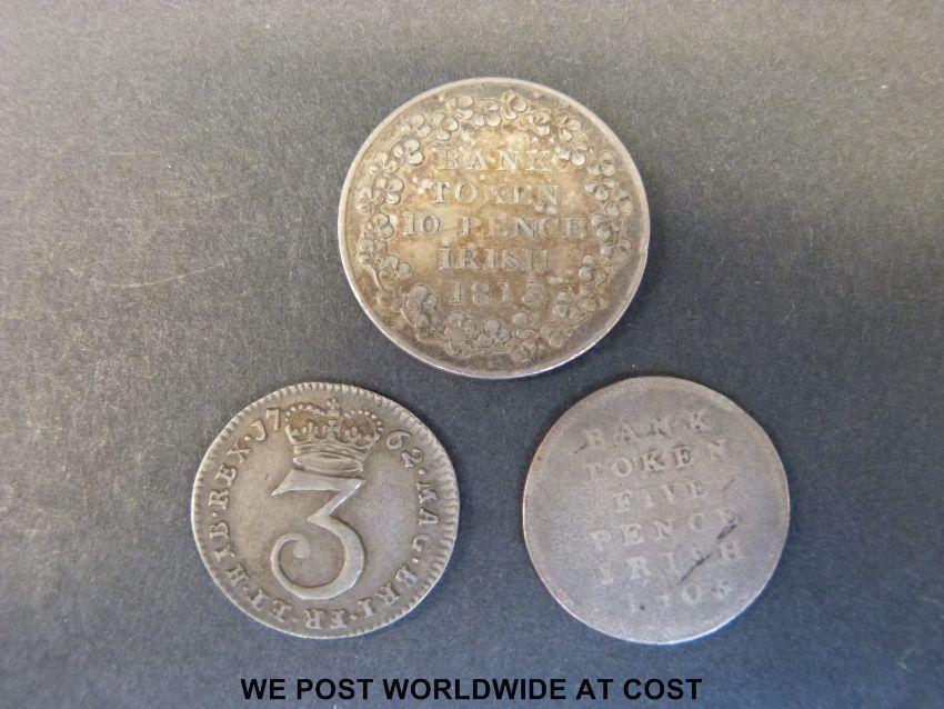 Two 19thC bank tokens comprising George III 1805 five pence and Irish George III 1813 ten pence, and a George III maundy three pence of 1762