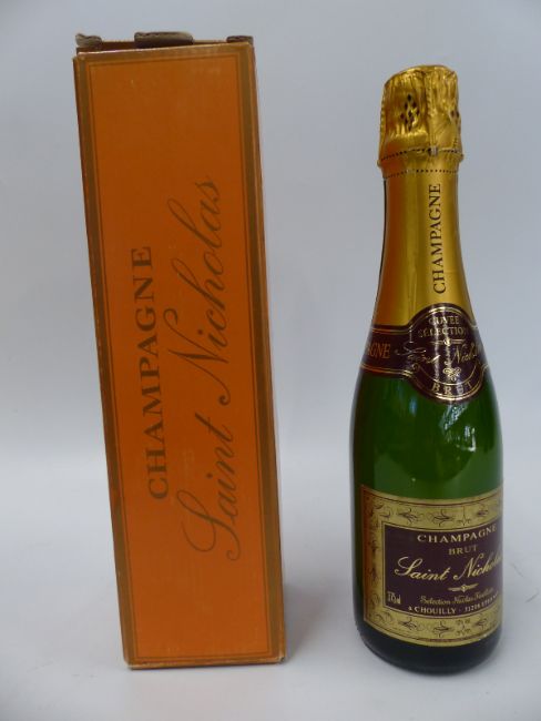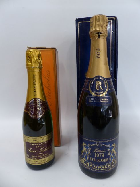 Saint Nicholas champagne, 375 ml, 12% volume, together with a bottle of Millesime Pol Roger champagne (1979) 75cl, 12% vol