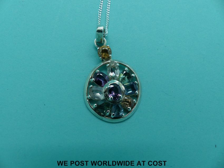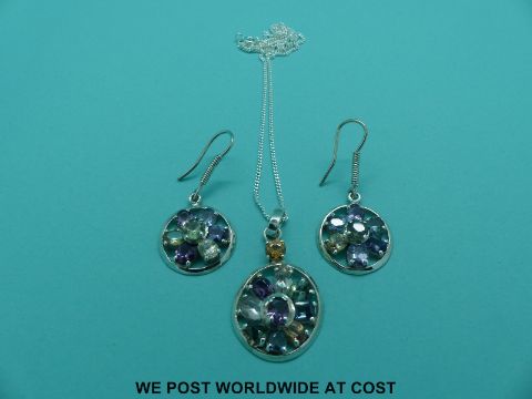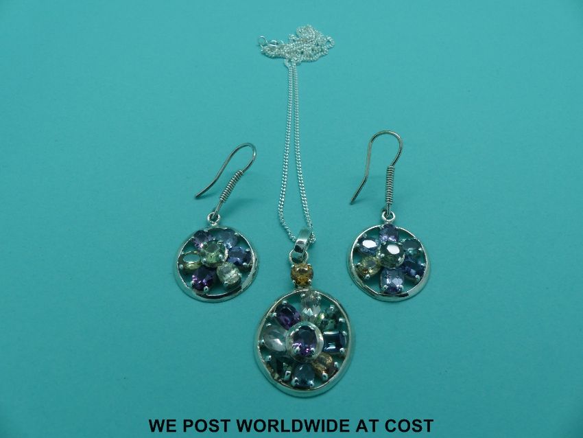 A silver necklace set with multi-coloured sapphires including a blue emerald cut, purple oval cut etc with a pair of matching earrings
