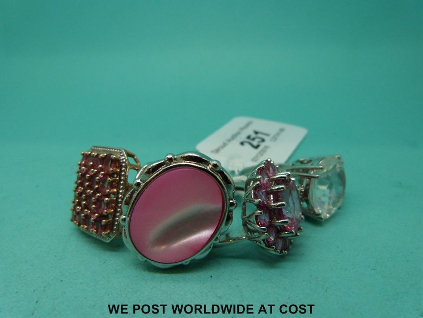 Four silver rings variously set with pink stones including sapphires and mother of pearl