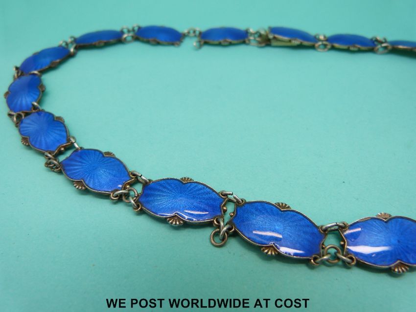 A Norwegian sterling silver necklace, each panel set with blue guilloche enamel