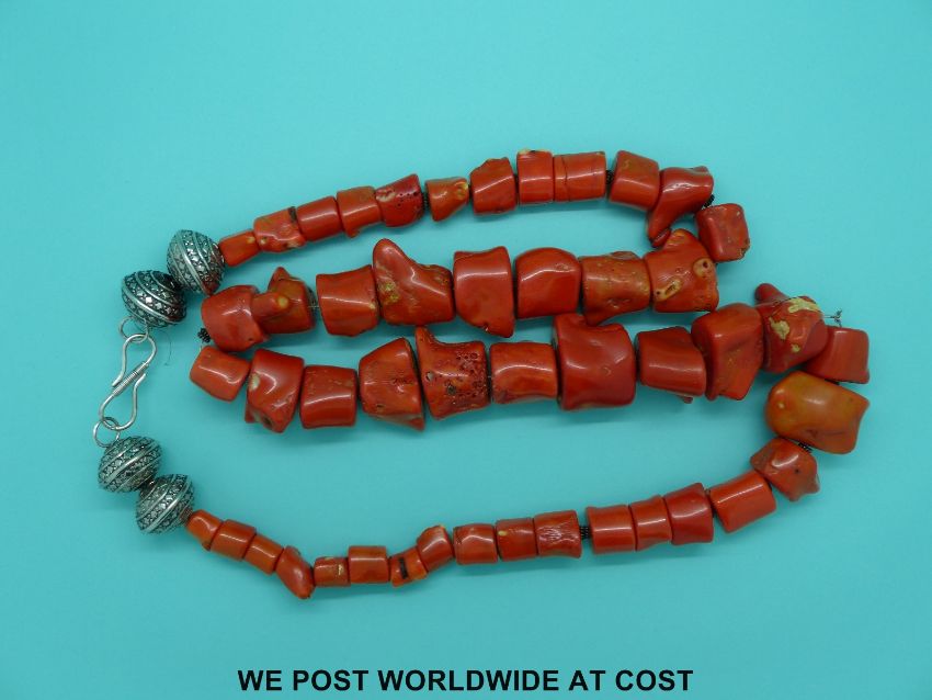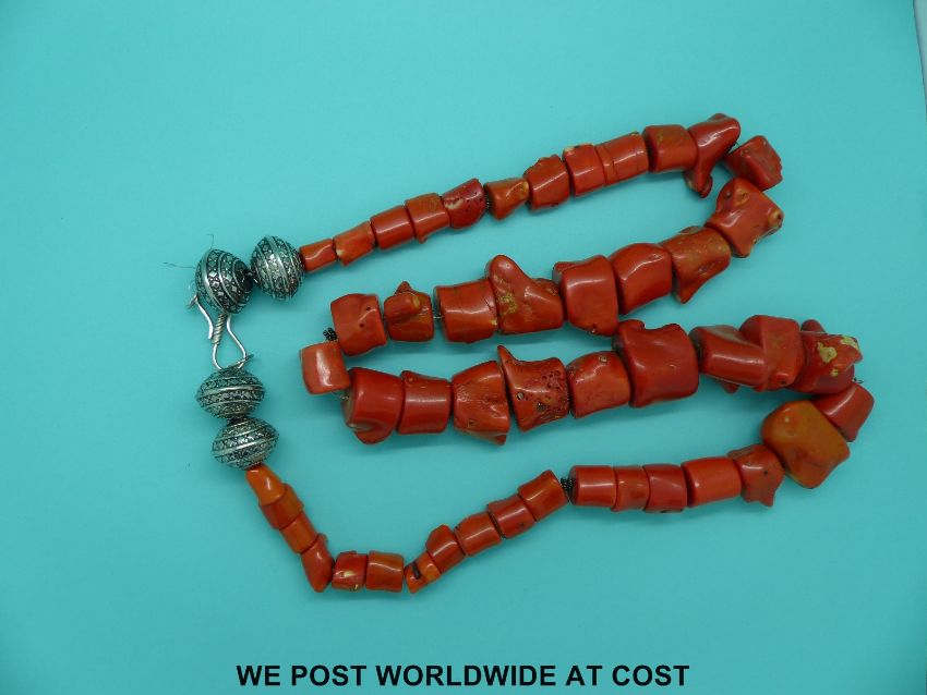 A very large coral style necklace of 48 natural graduated beads with embossed white metal fittings, 120cm long, 963g.