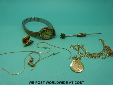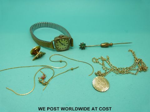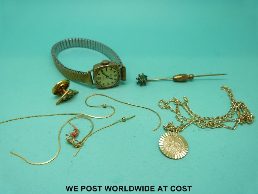 A 9ct gold cased watch, 9ct gold St Christopher, 9ct gold necklace etc