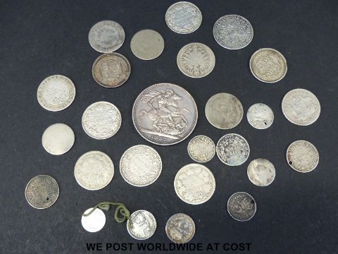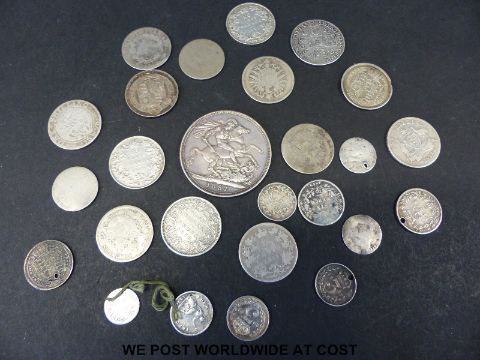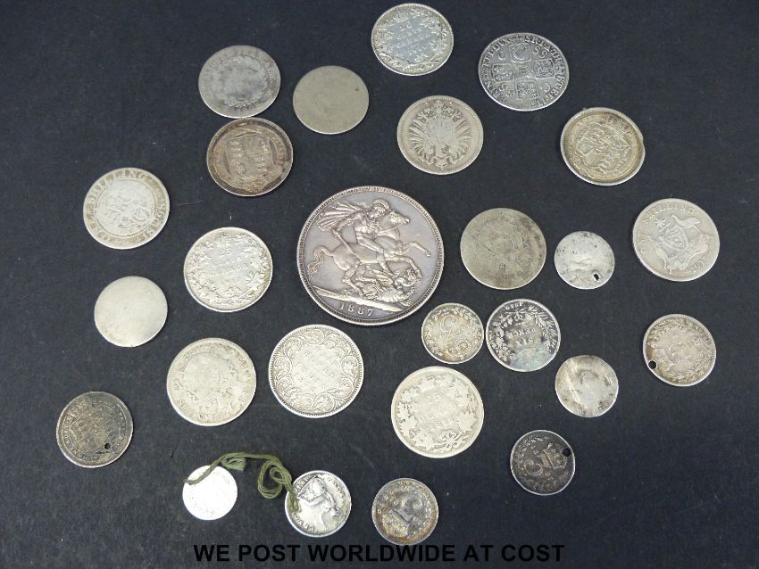 A Victorian 1887 Jubilee crown, together with a further cachet of pre 1900 silver, including George I SSC. shilling, George III, Napoleon 1808 etc. total weight 122g