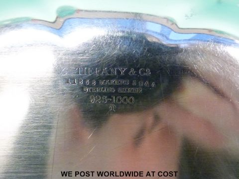 A late 19thC Tiffany & Co white metal oval twin handled bowl with pierced and floral handles/rim, marked Tiffany & Co. makers Sterling Silver 925-1000 T and with numbers 11858 and 5944, width 30cm (480g)