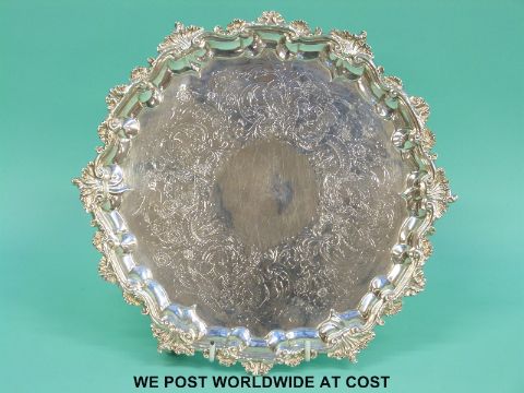 A George IV hallmarked silver salver with decorative rim raised on three scrolling feet, Ldn 1826 maker Robert Hennel, diameter 26.5cm (543g)