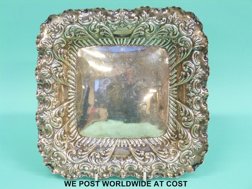 A hallmarked silver square bowl with embossed rim, Sheffield 1901 maker Fenton Brothers Ltd, width 23cm (349g)