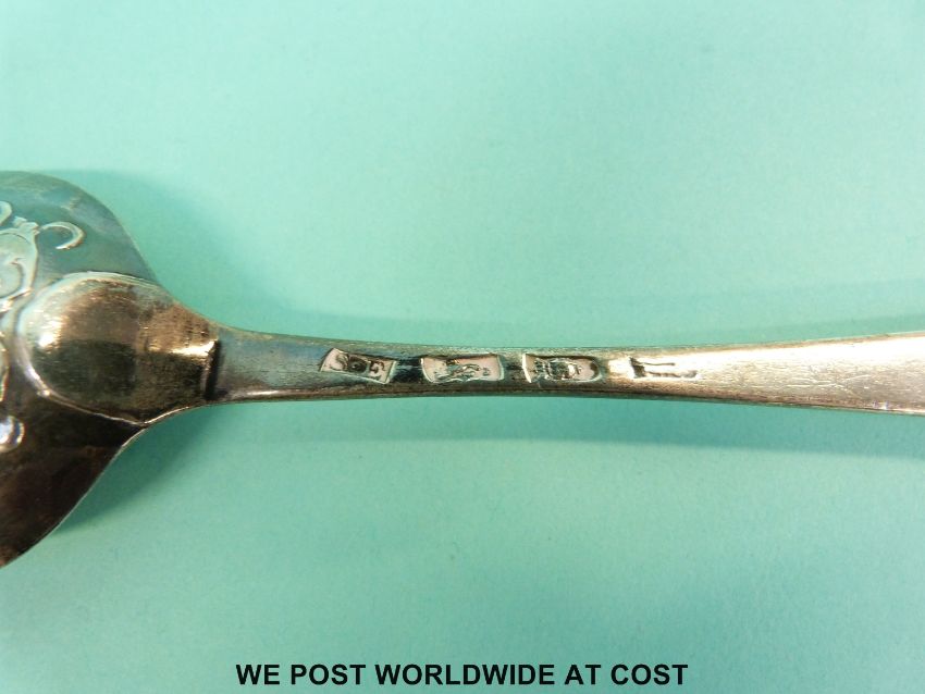 A HM silver bottom marked dessert spoon, London maker Samuel Eaton but date letter rubbed (model GB 1763 to top)