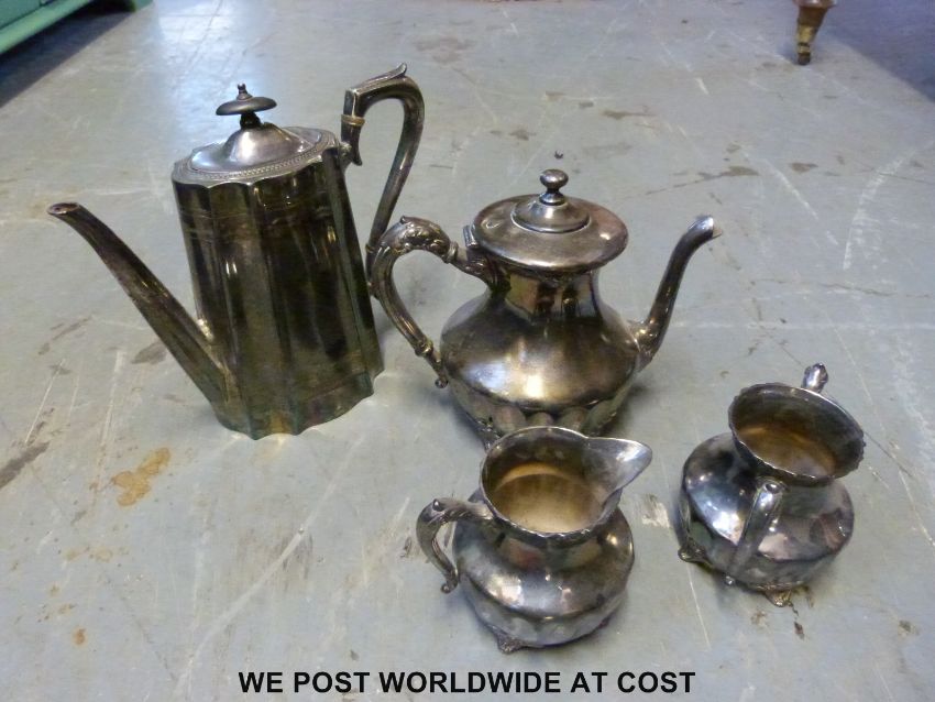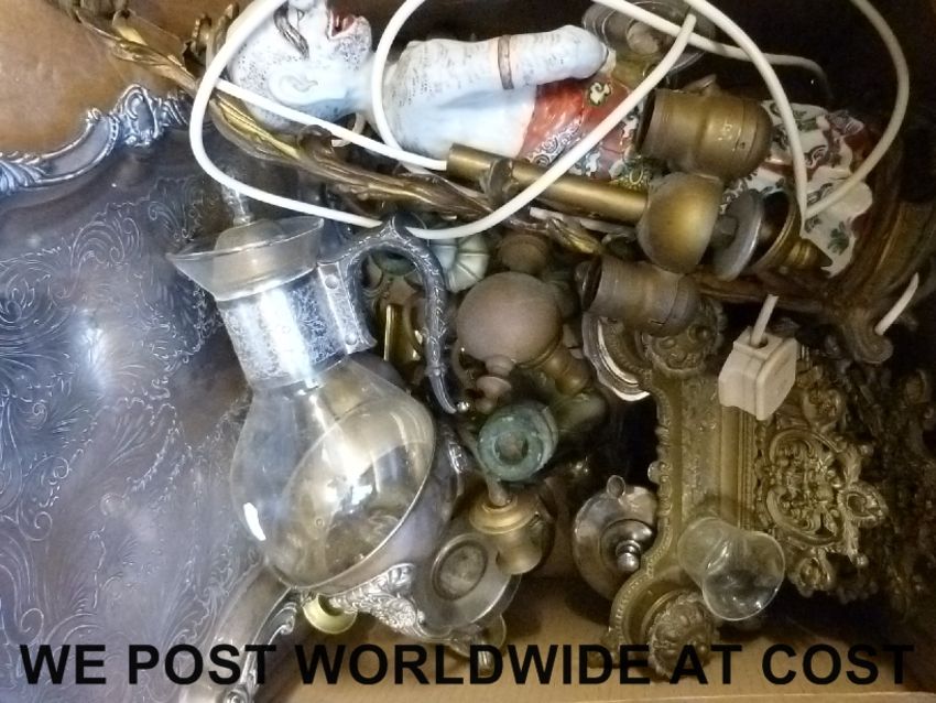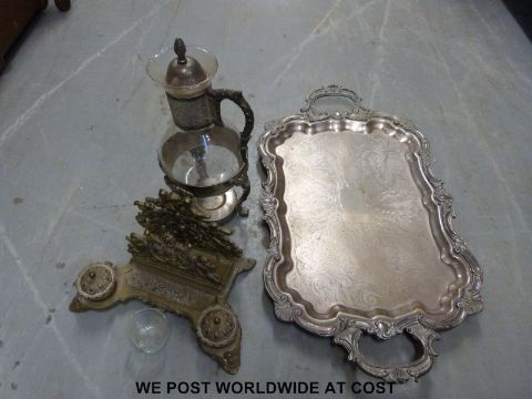 A collection of plated ware, brass candlesticks, desk tidy, wall lamps