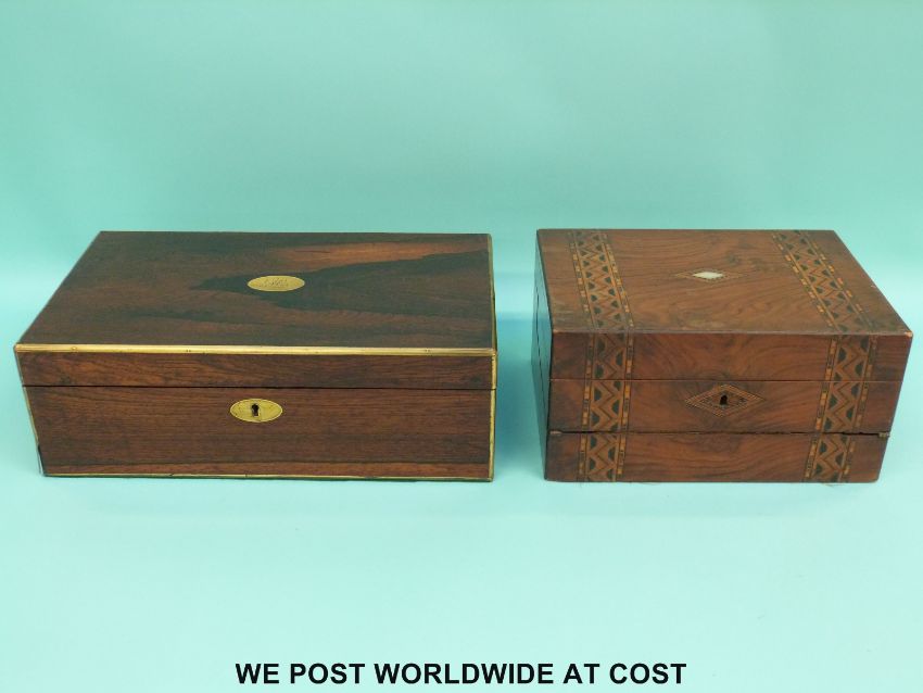 A 19thC rosewood writing slope (W40.5xD24xH12cm) together with an inlaid example