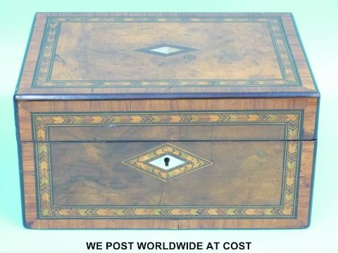 A Victorian burr walnut and Tunbridge ware inlaid work box with fitted interior (W28xD20xH14cm)