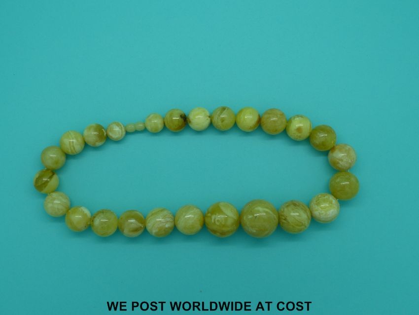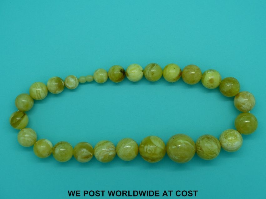 An amber necklace of 25 graduated spherical yellow coloured beads, the largest 30mm in diameter, 50cm long, 117g.