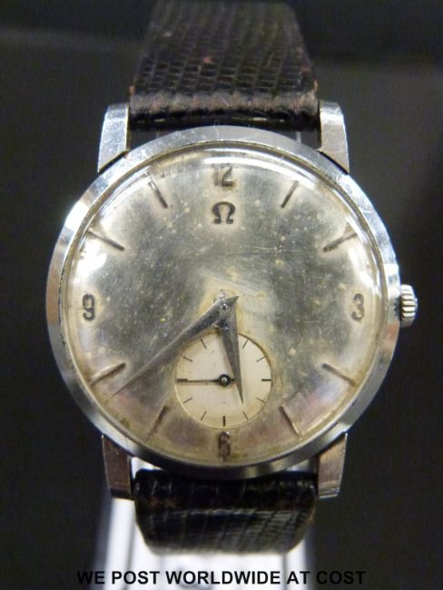 Omega gentleman's wristwatch with inset subsidiary seconds dial and polished steel face, on black leather strap, case diameter 33mm.