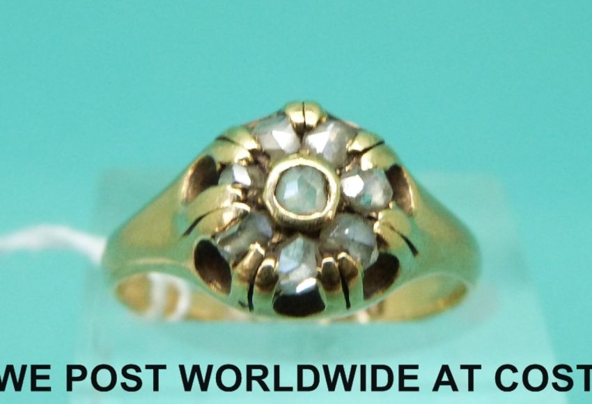 An 18ct gold ring set with rose cut diamonds in a flower cluster (size O)