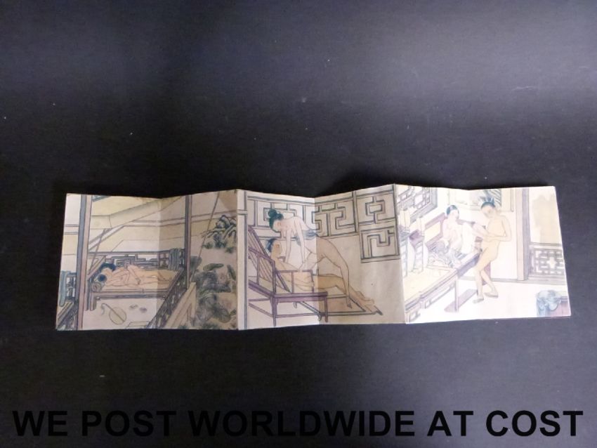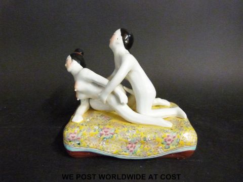 A ceramic erotic model of a couple on a yellow cushion (length 18cm) together with a wooden-bound book with similar pictures within