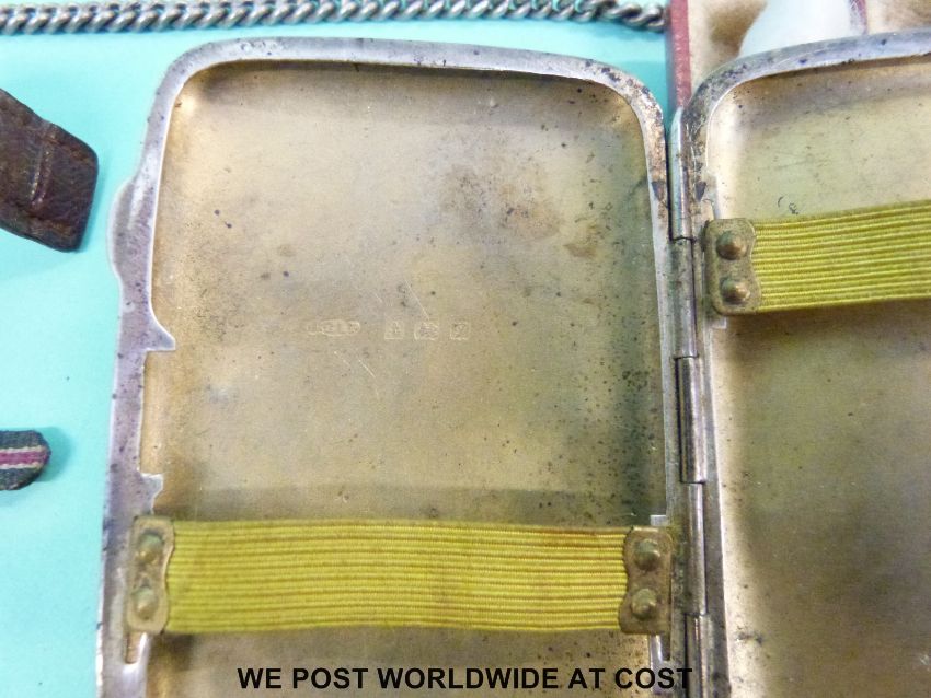 A quantity of silver and other collectables to include Aurar Island coin bracelet, hallmarked silver cigarette case (48g), South Africa 1900 IY badge, silver watch chain, silver vesta, cabochon set, cross, gold stick pin etc