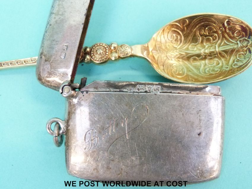 A hallmarked silver vesta, silver propelling pencil, silver gilt spoon and a pair of lorgnettes