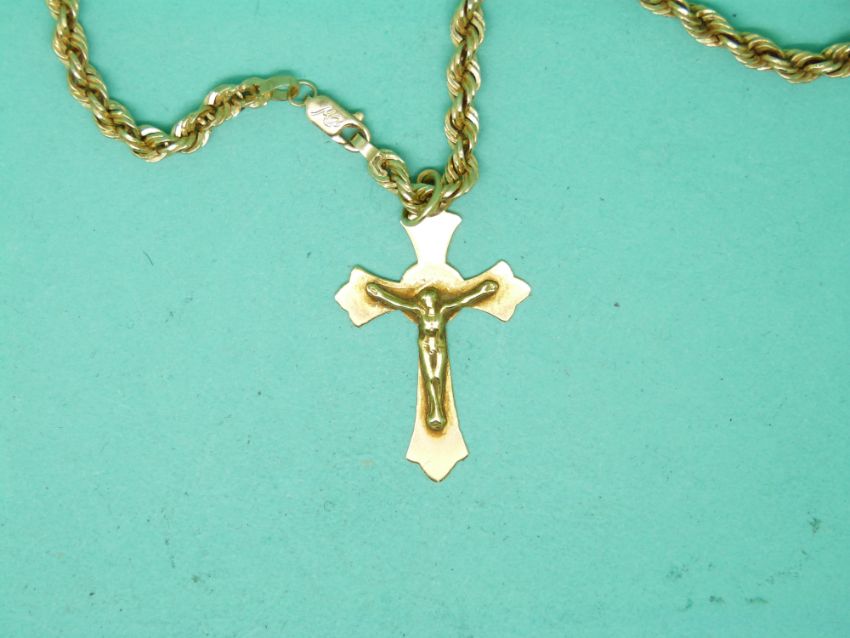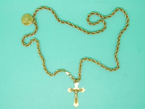A yellow metal rope twist necklace marked 14k with yellow metal crucifix and 18ct gold medallion (10.7g all in)