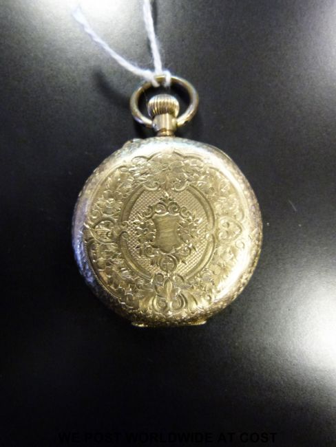 Cuivre Swiss yellow metal ladies keywind fob watch with chased decoration to case, stamped 9K, no. 131939, the self coloured dial with floral and foliate decoration, stylized Arabic numerals, and blued steel hands