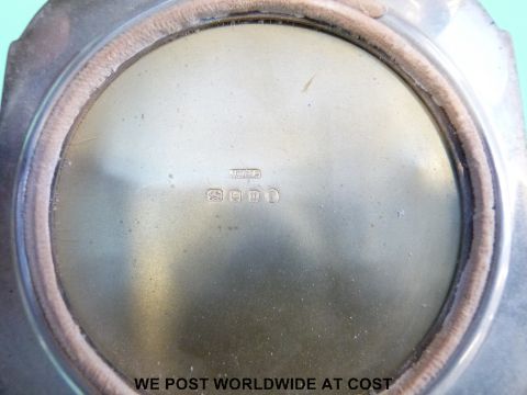 A J W Benson Art Deco hallmarked silver compact with engine turned back and aqua guilloche enamel front, London 1933, width 8cm