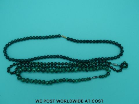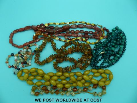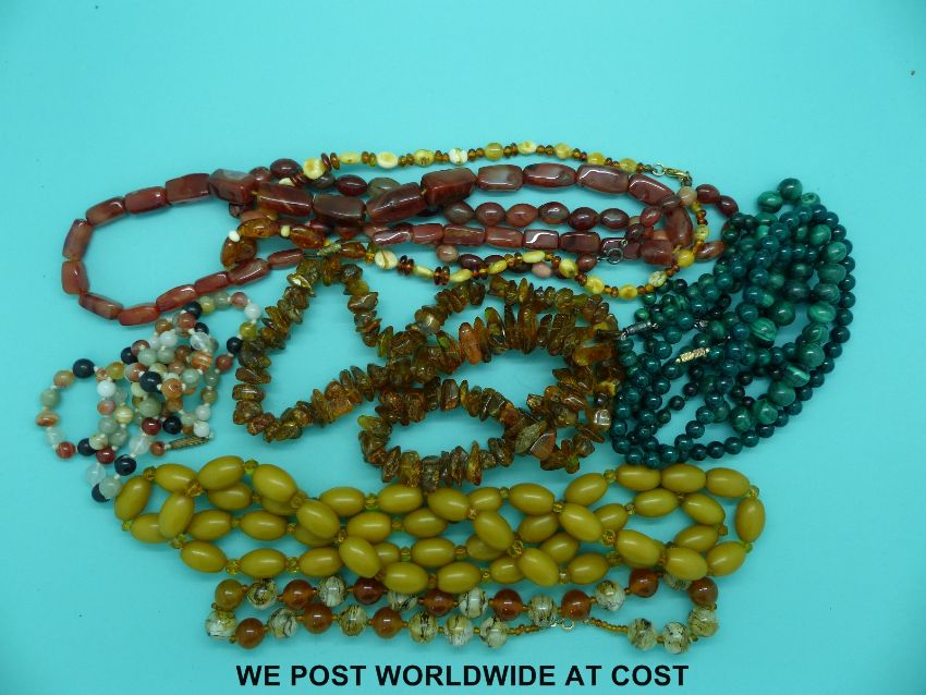 A collection of beaded necklaces to include malachite, two carnelian agate, another agate example, glass necklace and a bakelite necklace