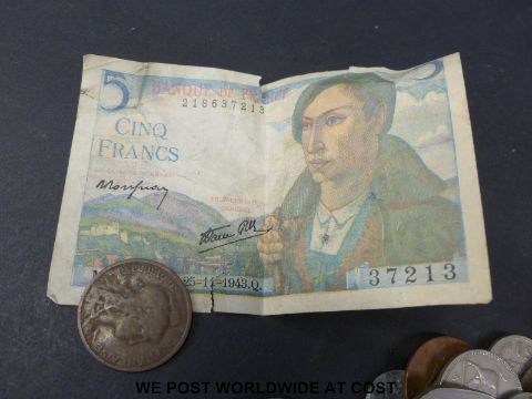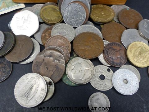 A small quantity of world coinage including Irish (small silver content) in a wooden box
