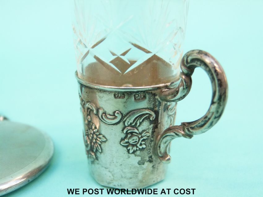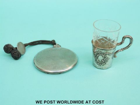 A hallmarked silver compact with engine turned decoration and a white metal mounted drinking glass, stamped 800