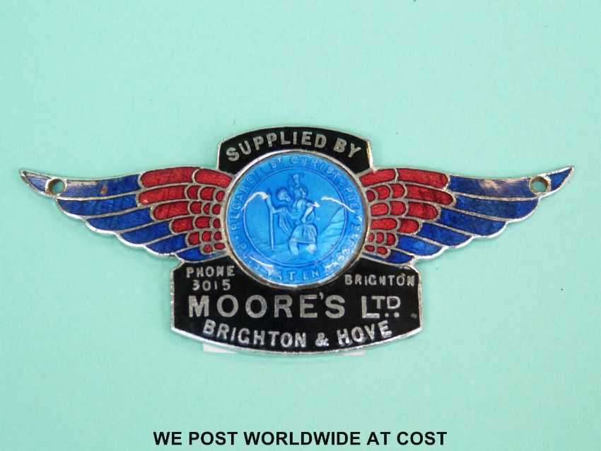 A guilloche enamel vintage car dashboard plaque or St. Christopher supplied by Moore's Ltd Brighton and Hove, impressed verso Gaunt & Son London (width 7.5cm)