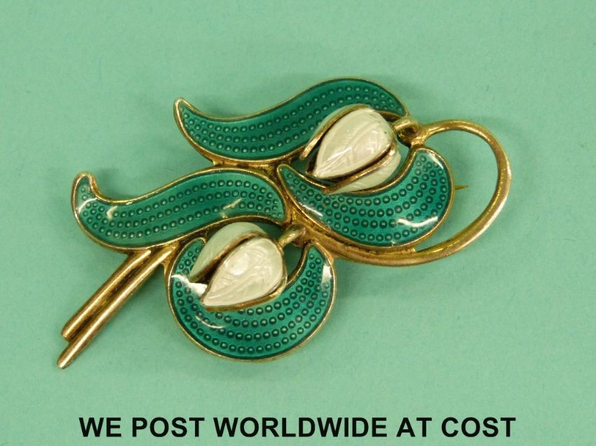 A Norwegian silver and enamel brooch in the form of lily of the valley, stamped to the back 'Made in Norway Sterling 925S'.