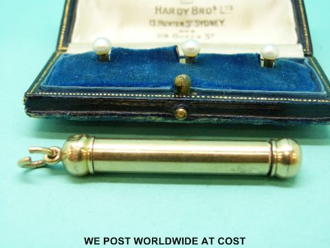 A set of three 15ct gold studs in Hardy & Co, Brisbane, Australia fitted case and yellow metal propelling pencil by W.S.Hicks, New York.