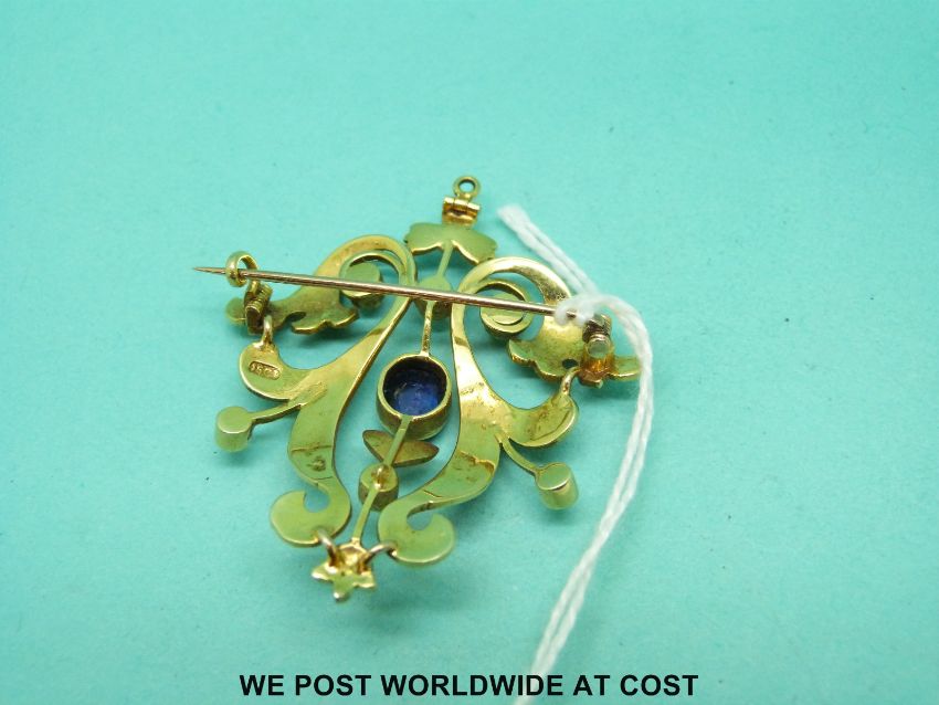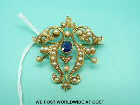 A 15ct gold brooch/pendant set with a sapphire and seed pearls