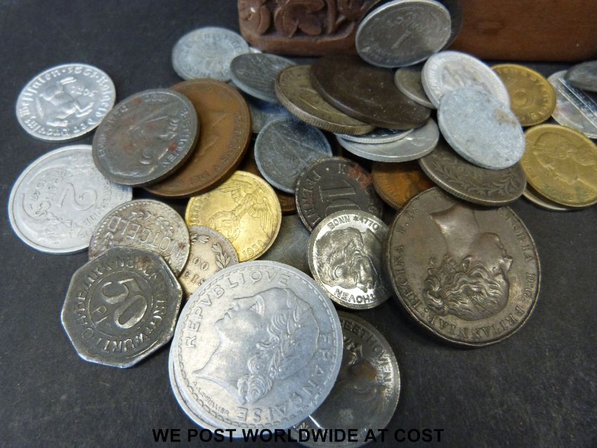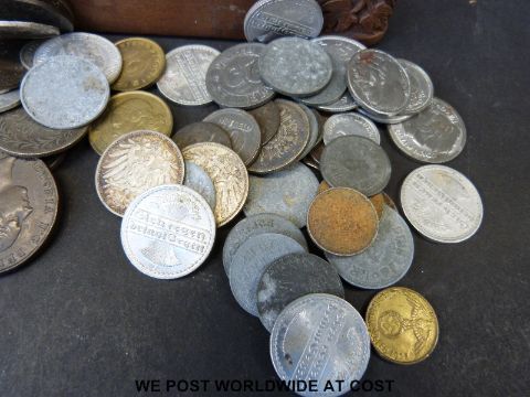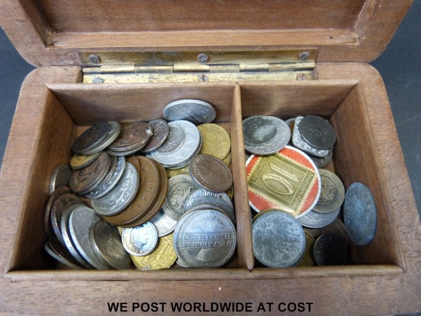 A collection of overseas coinage, together with early twentieth century German Notgeld coins etc. small silver content, in carved wooden box