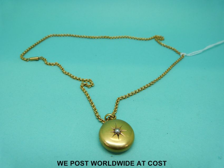 A Victorian locket marked 15ct set with a pearl on a yellow metal chain marked 15ct (9.8g)