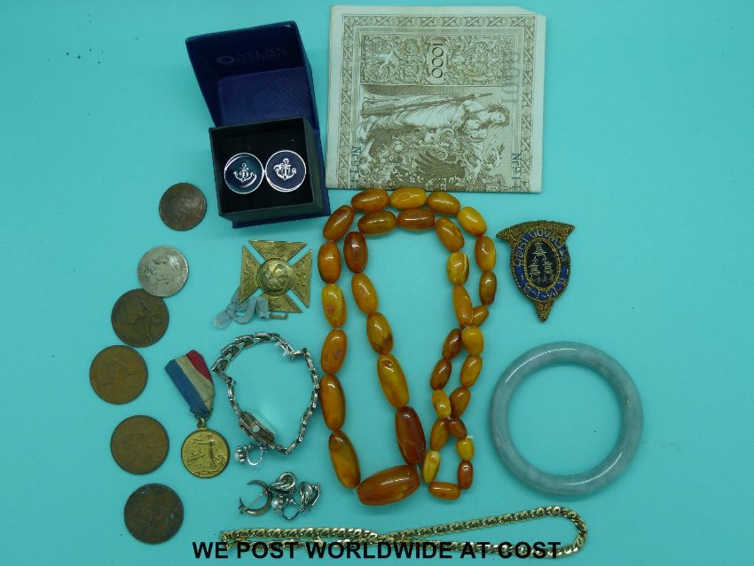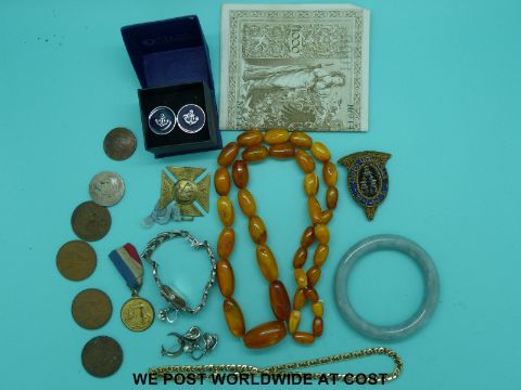 An amber necklace jadeite bangle, bank note, brooch, etc