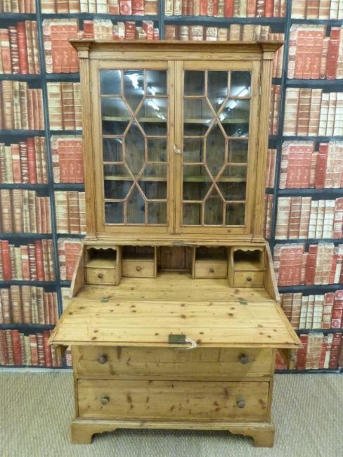 A 19thC pine astragal glazed bureau bookcase with two over two graduated drawers raised on bracket feet, the bureau with fitted interior (H204xW104xD53cm)