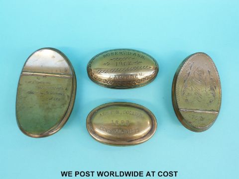 Four 19thC / 20thC brass gamekeeper's snuff boxes, Arthur Collier 1892 Corsham, Wilts; W Griffin, Kingston St Michael, Wilts; Mr Wicks 1894 and Robert Dash 1902 Capcoch