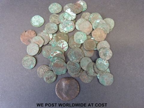 Approximately sixty eight uncleaned unresearched ancient hammered bronze coins, each approximately 14mm in diameter, together with a larger Roman example 24mm in diameter