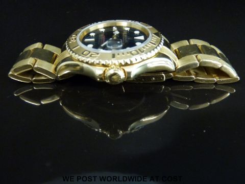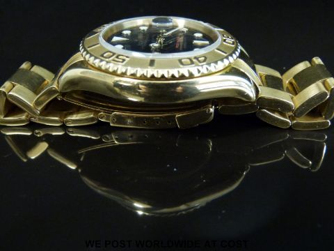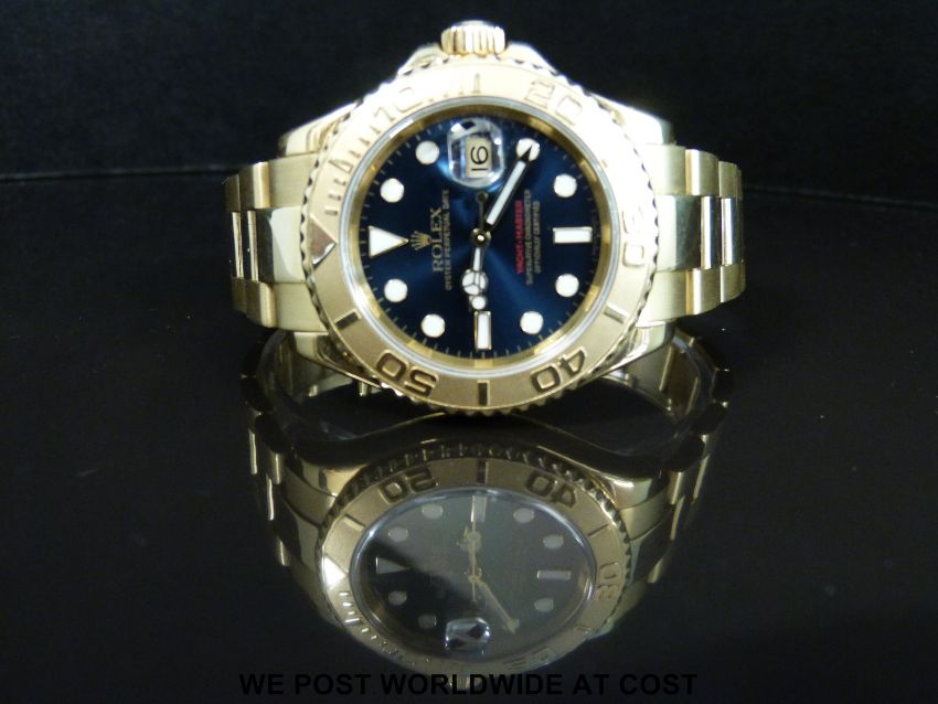 Rolex Yacht Master Oyster Perpetual Date 18ct gold gentleman's wristwatch with blue slate dial, date aperture and luminous hands and markers, on 18ct gold bracelet, case diameter 40mm, in original case with outer box, tags and related paperwork.