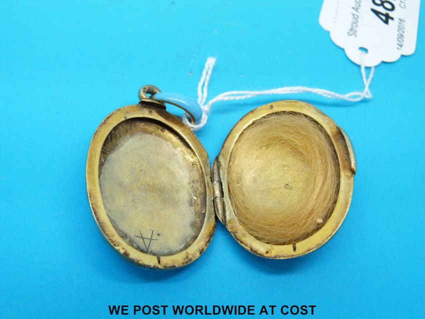 A Victorian yellow metal locket set with seed pearls on a blue enamel ground
