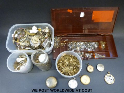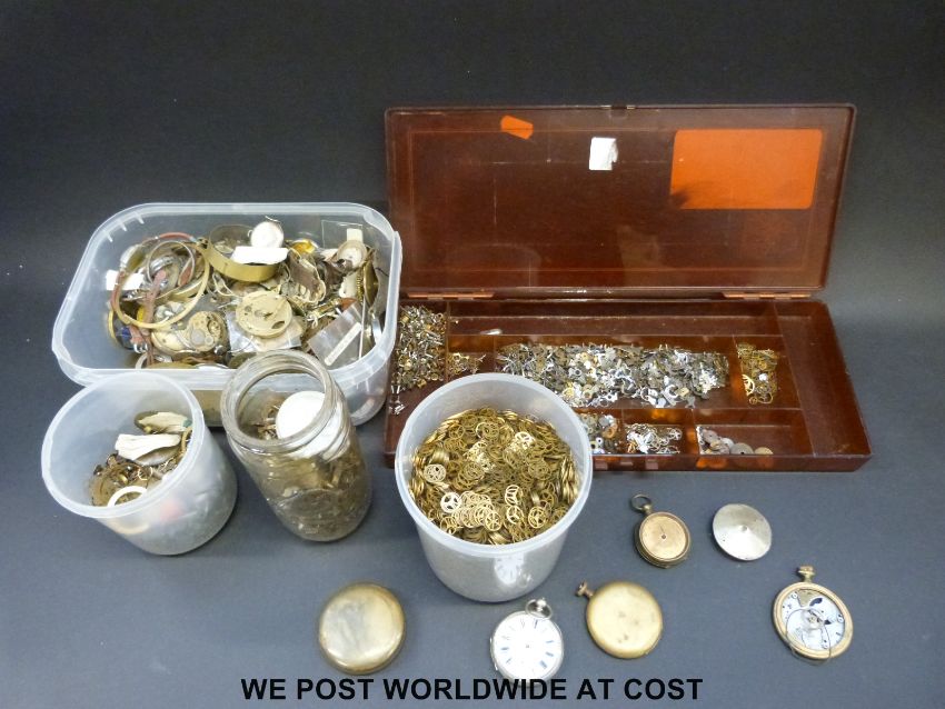 A large quantity of pocket and wristwatch parts including 'thousands' of new balance wheels and some silver parts.