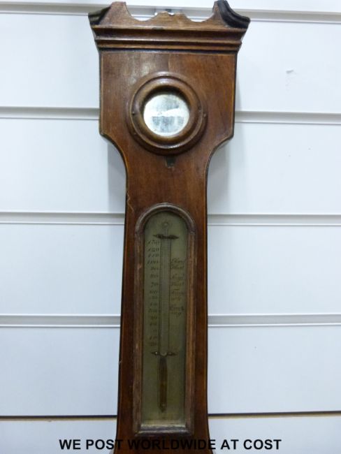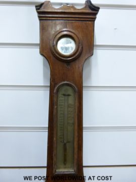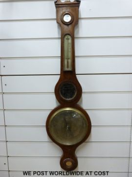A 19th century mahogany barometer with banded boxwood and ebony inlay, main brass dial 20cm diameter, matching inbuilt thermometer