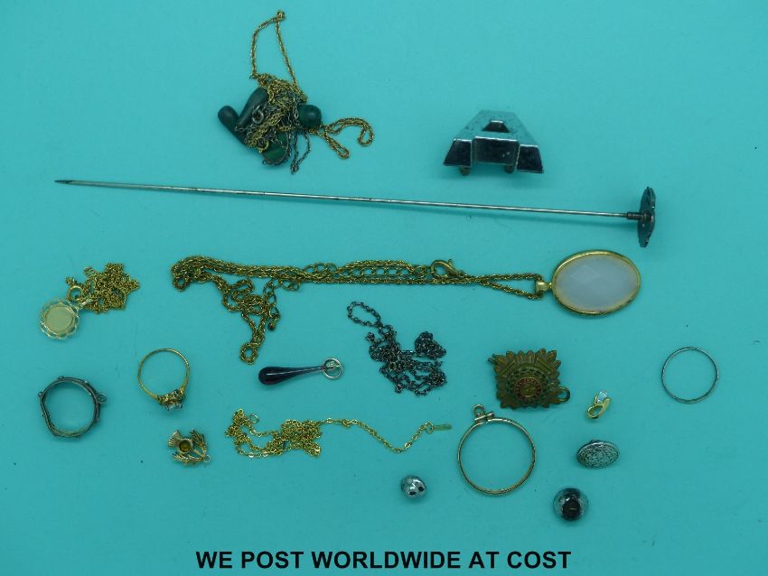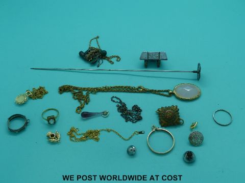 A silver hat pin, vintage jewellery boxes malachite necklace, etc.