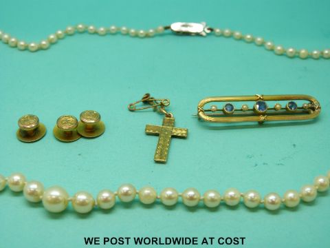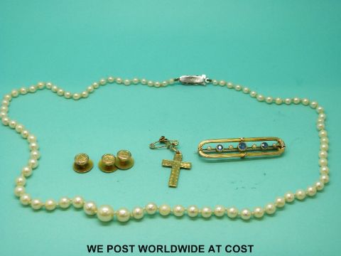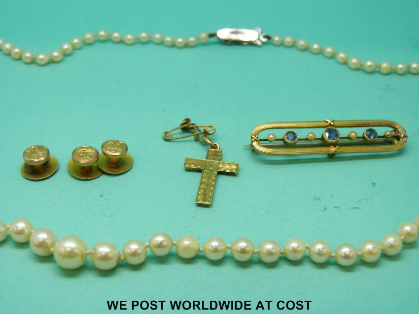 A 15ct gold brooch set with sapphires and seed pearls, three 9ct gold studs, a yellow metal cross pendant and a single strand of pearls