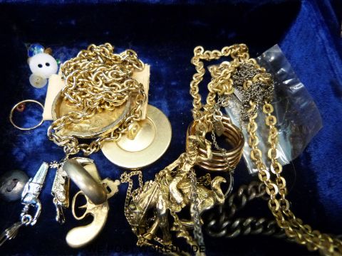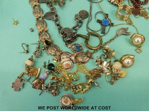 An inlaid musical jewellery box containing costume jewellery, silver enamel and marcarsite St Christopher, collection of earrings, etc.