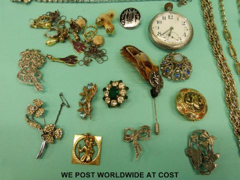A collection of costume jewellery to include white metal earrings, pocket watch, Siam jewellery, etc.